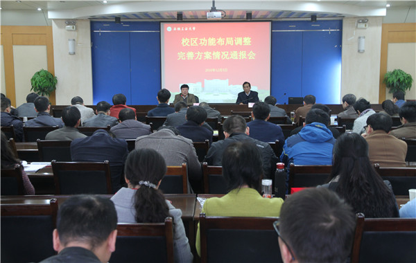 12月5日下午,学校在校佳山校区学术会议中心召开校区功能布局调整完善方案情况通报会,校长李家新作情况通报。校党委副书记陈润主持会议,各学院(部)院长(主任),教代会执委,分工会委员,教代会、党代会部分代表,各民主党派负责人参加了会议。